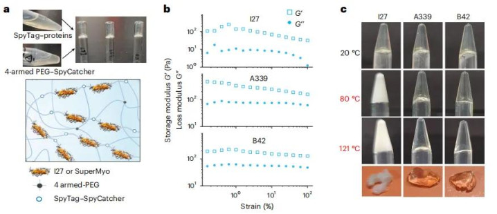 团队进一步展示了从单分子到宏观材料的转化潜力。他们利用SpyTag/SpyCatcher系统,将SuperMyo与四臂聚乙二醇交联,制备出透明的水凝胶。对比实验展现了惊人的差异:用天然I27制备的水凝胶在80摄氏度时浑浊软化,而SuperMyo水凝胶在121摄氏度的高压蒸汽灭菌条件下仍保持透明和凝胶态。